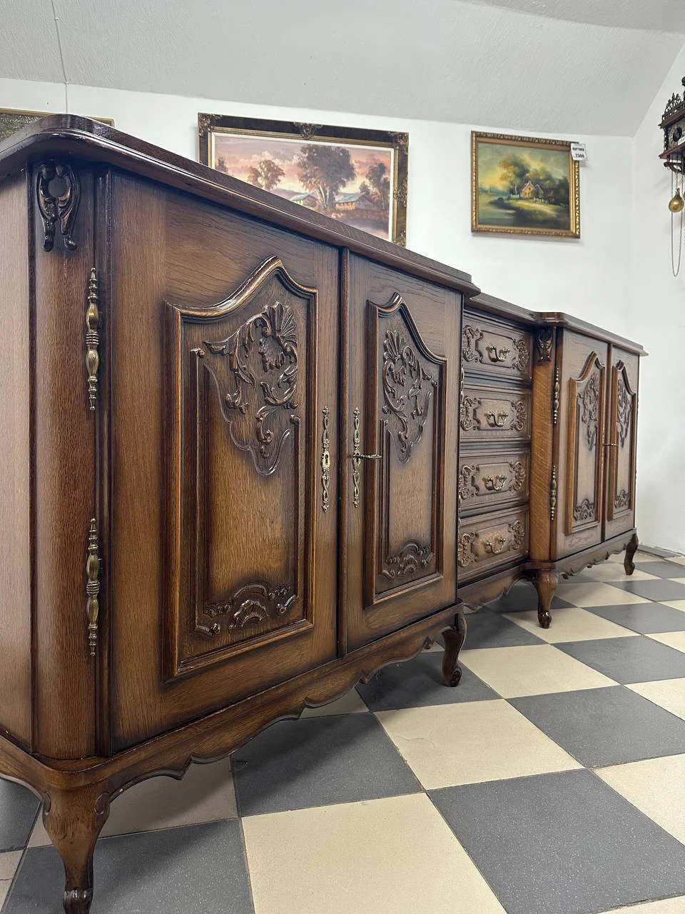 Цей масштабний буфет-комод вражає своєю монументальністю та продуманою композицією. Його довга горизонтальна форма створює відчуття стабільності та статусності, а теплий глибокий відтінок дерева з м’якими переходами від світлого до темного додає виробу вишуканої глибини. Верхня декоративна накладка з різьбленим елементом підкреслює центральну вісь композиції.