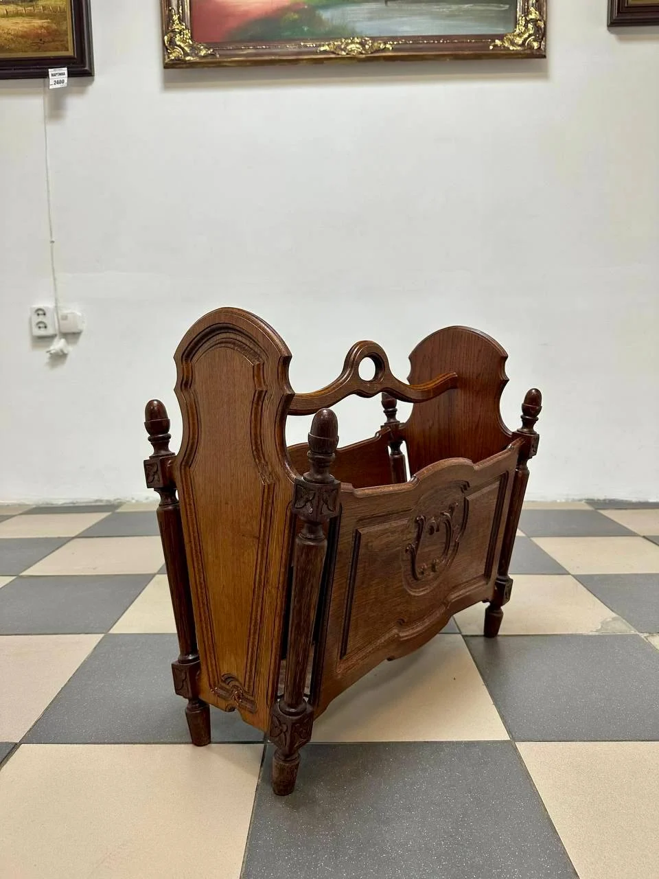 Ця елегантна підставка втілює традиції європейського меблярства XIX століття, де дуб символізував міцність і довговічність. Виготовлена з масиву дуба з глибоким горіховим відтінком, вона прикрашена ручною різьбою: центральний медальйон з квітковим візерунком у стилі рококо, фігурні спинки з плавними вигинами та точені балясини. Поверхність вкрита натуральним воском, що підкреслює природну текстуру деревини з вираженими річними кільцями та м’яким блиском.