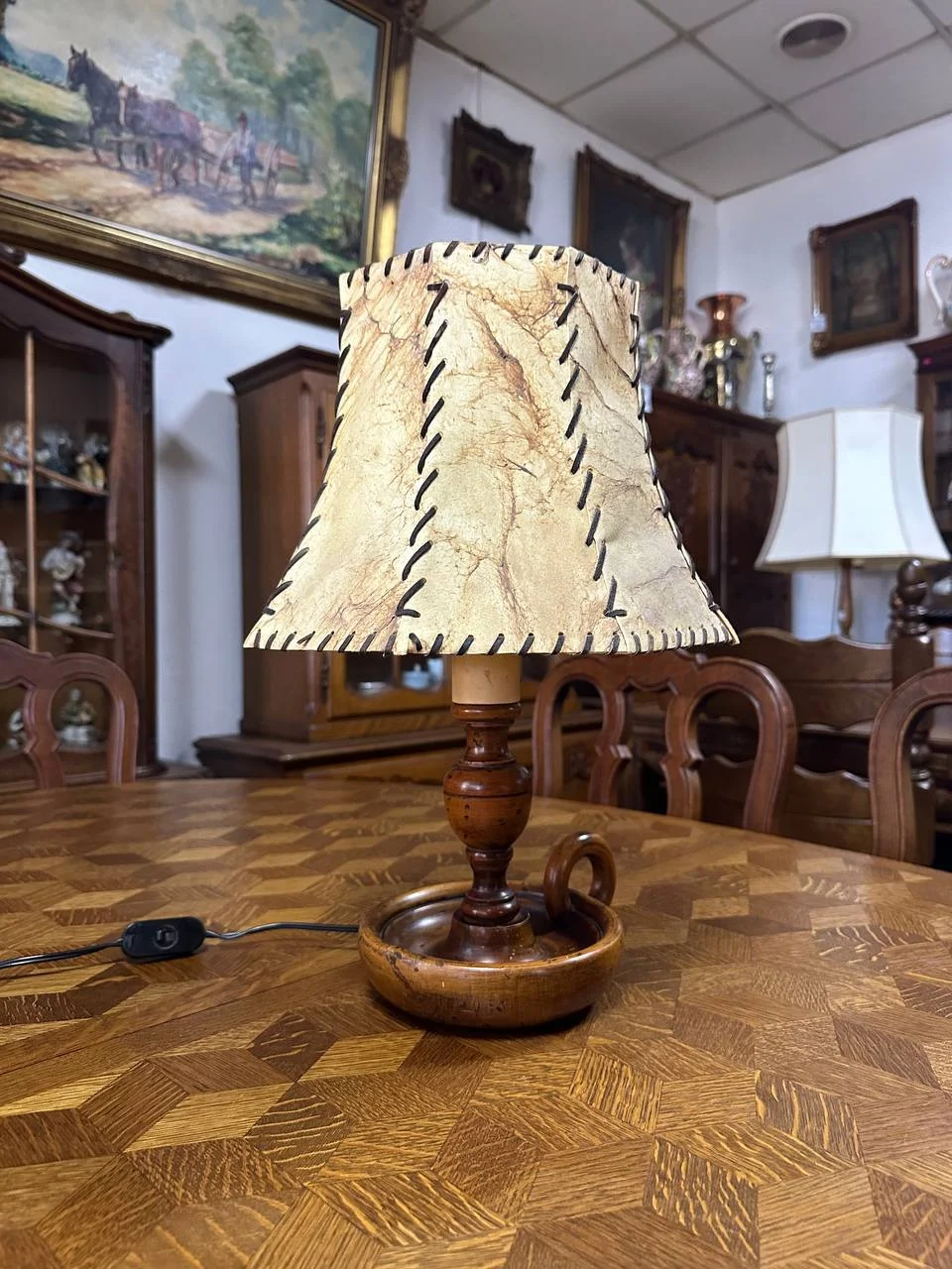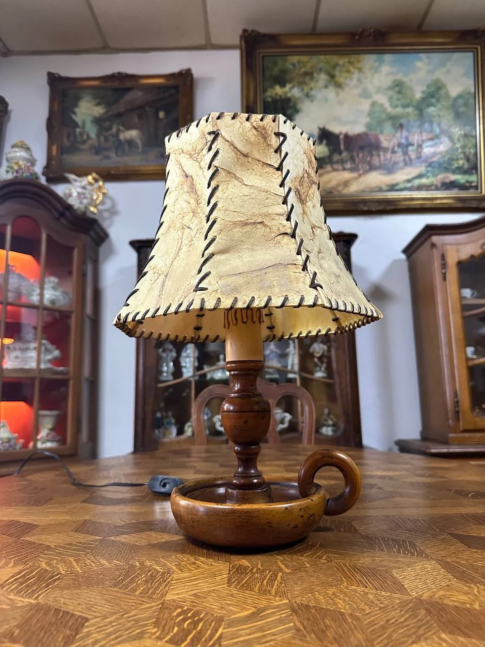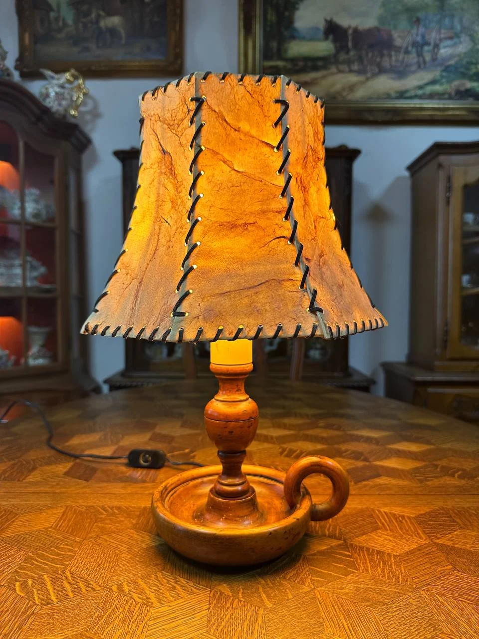 Настільна лампа з абажуром із натуральної шкіри на дерев’яній основі — це вишуканий вінтажний світильник, що поєднує природну теплоту матеріалів з майстерним виконанням. Трапецієподібний абажур з кремово-бежевої шкіри, прикрашений контрастним чорним стібком, створює ефект ручної роботи та додає характеру. Масивна дерев’яна основа з балясовидною ніжкою та круглою стійкою з декоративною ручкою-петлею забезпечує стабільність і підкреслює класичний стиль. Коли лампа увімкнена, шкіра просвічується м’яким золотисто-оранжевим світлом, наповнюючи приміщення затишним, живим сяйвом, яке приємно ласкає око.