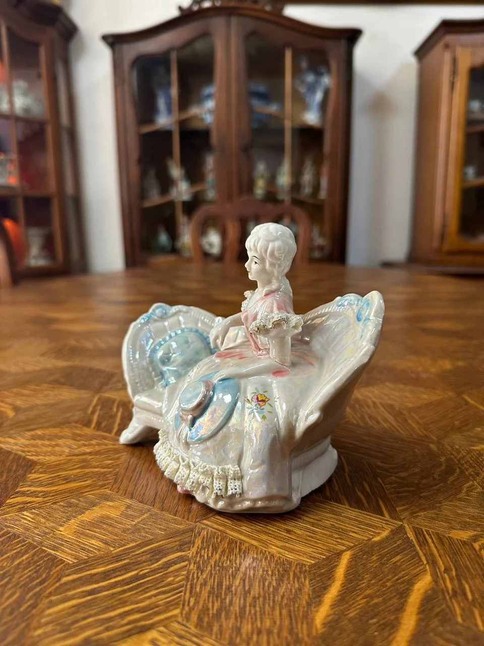 Фігурка виконана з тонкої глазуреної порцеляни з теплим кремово-білим відтінком і м’яким перламутровим блиском. Розпис зроблений вручну з делікатними акцентами: ніжно-рожева сукня з блакитними вставками, золотаві банти та мереживо, дрібні квіточки на тканині. Кожен елемент промальований з ювелірною точністю — видно тонке мереживо на рукавах, складки сукні, що спадають, блиск стрічок і текстуру солом’яного капелюшка.