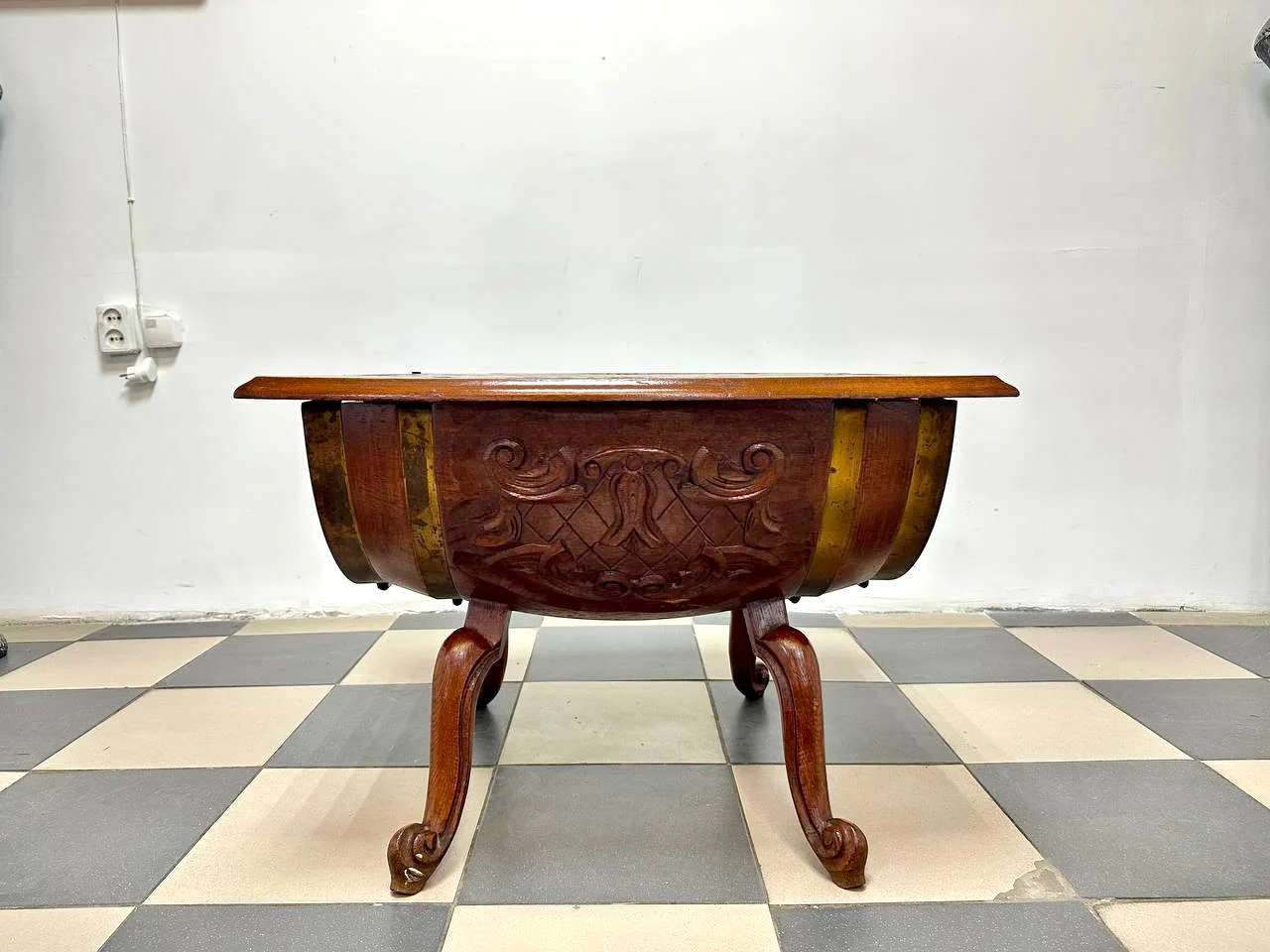 Майстерність виконання помітна у кожній деталі: від ідеально заокруглених боковин до фігурних ніжок. Ніжки, виконані у стилі “кабріоль” із різьбленням у формі лап, додають предмету візуальної динаміки та грації, попри його масивну основу. Додатковим декоративним елементом виступають латунні чи мідні смуги, які імітують обручі бочки, додаючи виробу вінтажного шику та автентичності.