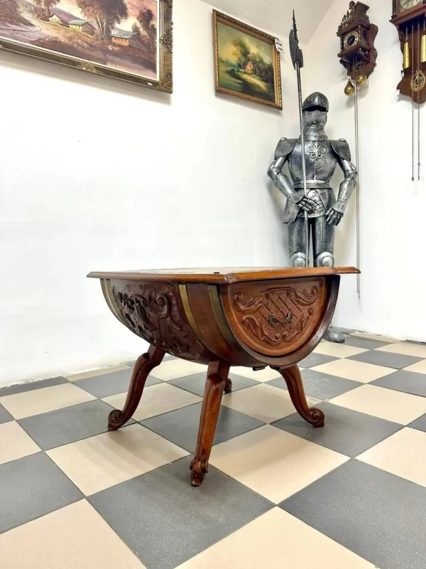 Цей стіл-бочка, що слугує міні-баром, є яскравим прикладом майстерного поєднання функціональності та глибокого, виразного стилю. Його дизайн апелює до класичних європейських традицій меблярства, де дерево цінувалося не лише за міцність, але й за естетичні можливості. Взявши за основу форму традиційної винної бочки, майстер перетворив її на витончений предмет інтер’єру, що несе відбиток багатої історії та культури.