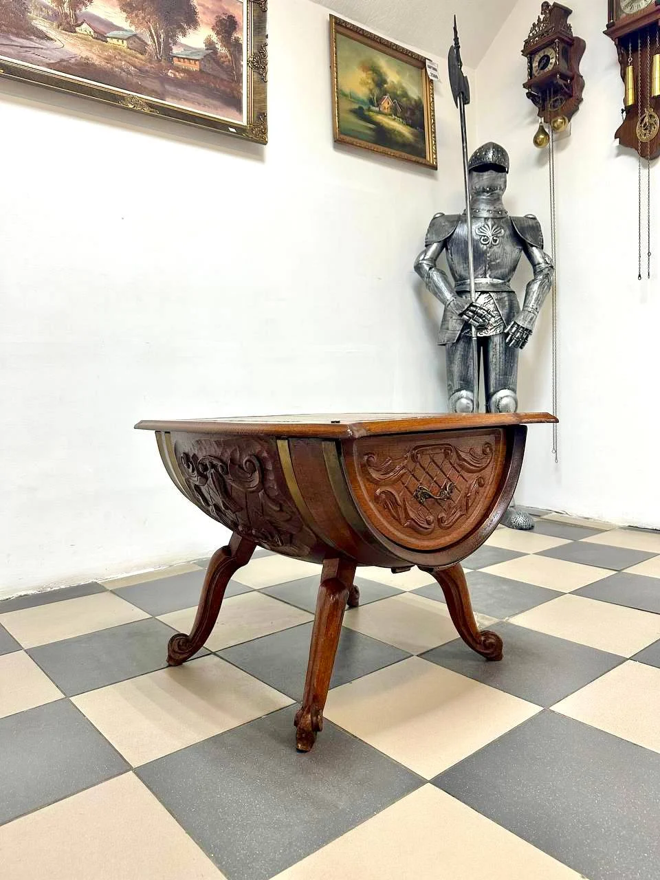Форма напівбочки, піднесена на елегантних фігурних ніжках, надає виробу водночас солідності та легкого, грайливого характеру. Глибокий, насичений коричневий колір дуба з вишуканою текстурою одразу привертає погляд, нагадуючи про благородні сорти деревини. Це не просто меблі, а справжній арт-об’єкт, що здатний розповісти історію про традиційне мистецтво різьблення.