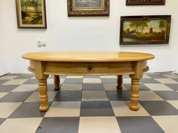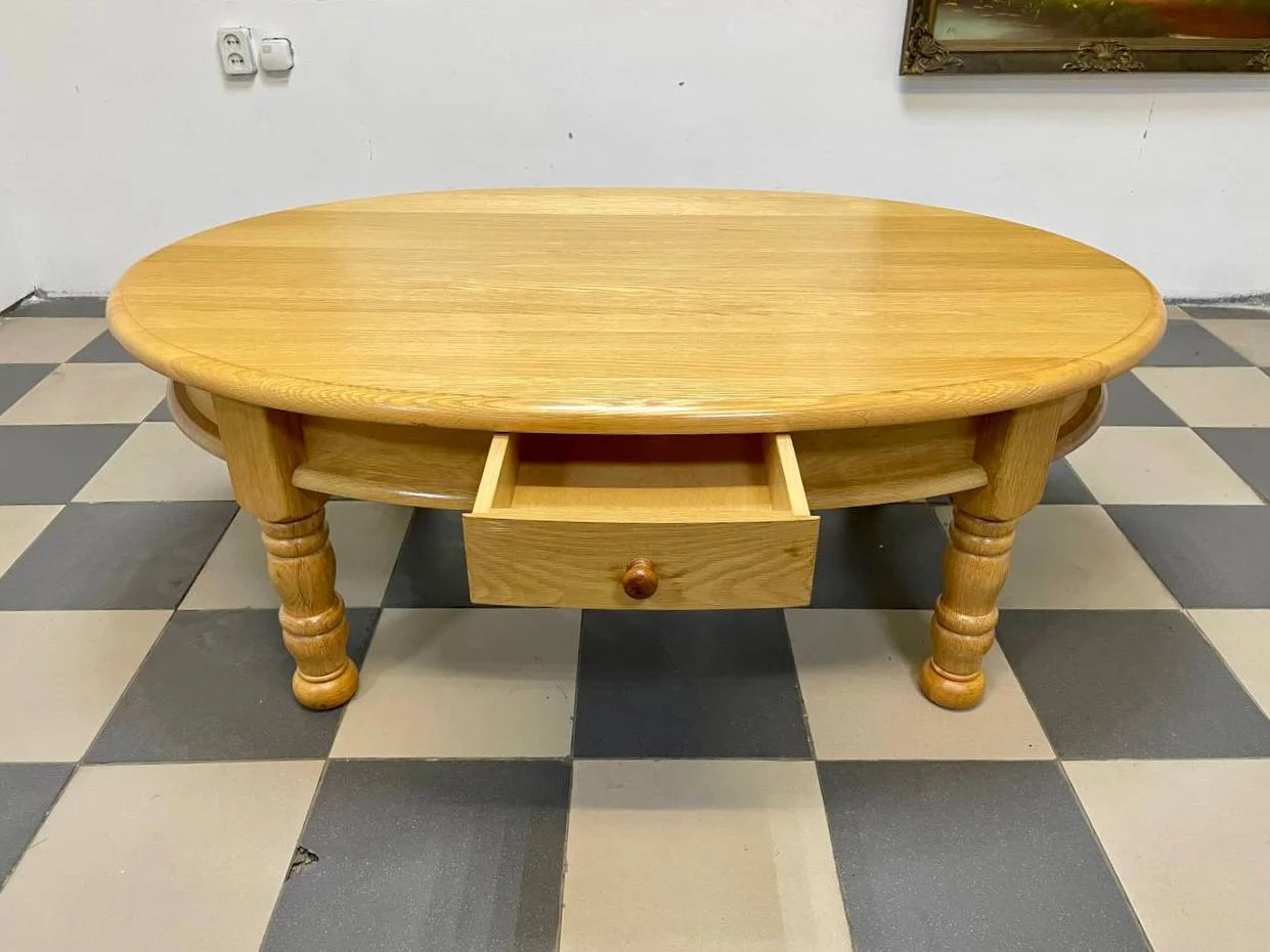 Уявіть, як цей стіл збирає навколо себе вашу родину та друзів. Його велика овальна стільниця ідеально підходить для вечірніх чаювань, настільних ігор чи просто для розміщення улюблених книг та декору. Масивні точені ніжки надають йому солідності та класичного шарму, а зручна шухляда дозволяє тримати під рукою пульти, журнали та інші дрібниці, зберігаючи порядок.